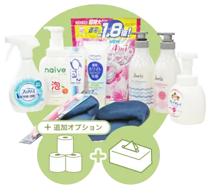 短期〜長期で利用いただける日用品セットをお部屋にお届けします。